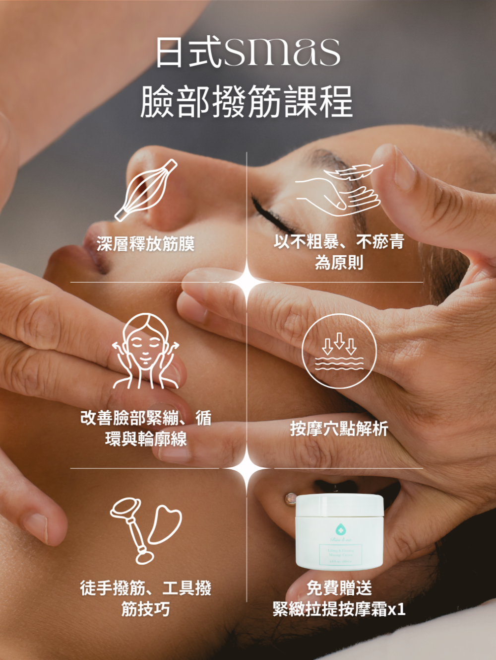 從認識臉部各個穴點開始,教您慢慢的鬆弛經絡,再針對各穴點由淺入深的按摩拉提,幫助客人解決鬆弛、老化、下垂等問題!